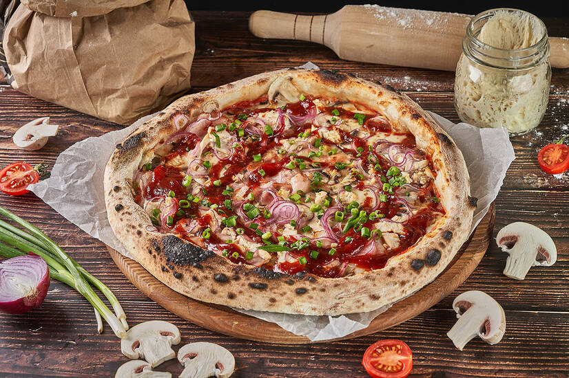 Складники: барбекю соус, сир моцарела, бекон, куряче філе, гриби печериці, синя і зелена цибуля.