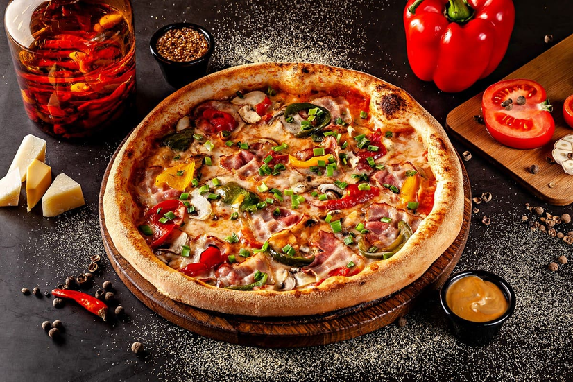 Складники: томатний соус пілаті, сир моцарела, бекон, гриби печериці, перець болгарський, зелена цибуля.