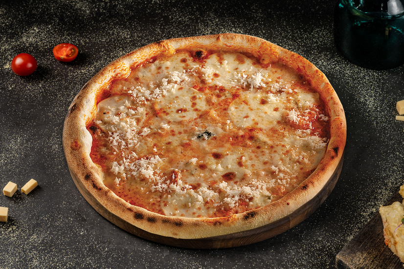 Складники: рожевий соус з вершків та томатів, сир моцарела, копчений сир, сир горгонзола, сир пармезан, часниковий соус.