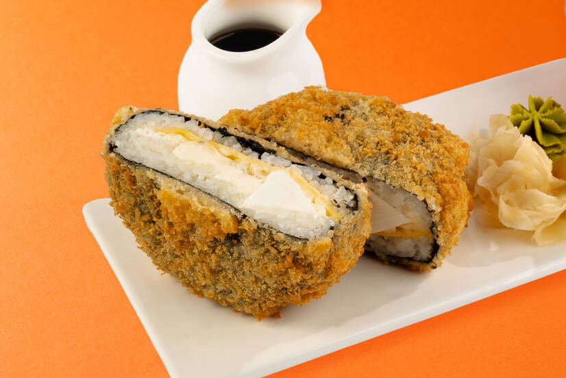 Рис, вершковий сир, сир гауда, сир фета, сир моцарела, водорості , в сухарях панко обсмажується у фритюрі в темпурі.