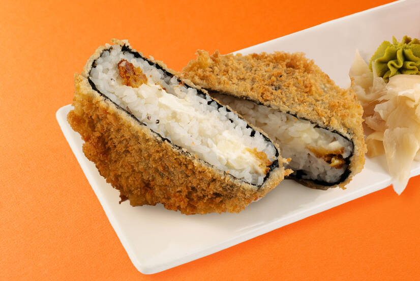 Рис, вершковий соус,курка в паніровці,водорості, сухарі панко, сиажиться у фритюрі в темпурі.